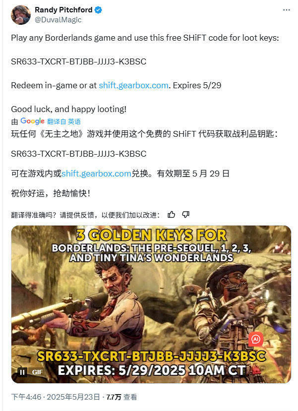 为缓和局势,Pitchford最近在推特发放全系列通用的SHiFT代码,可兑换3把黄金钥匙,但评论区迅速被讽刺声淹没:"真意外代码不是献给真粉丝""钥匙怎么不卖80美元?我们总会想办法的!"。显然,玩家的不满已从定价问题蔓延至对厂商信任度的质疑。