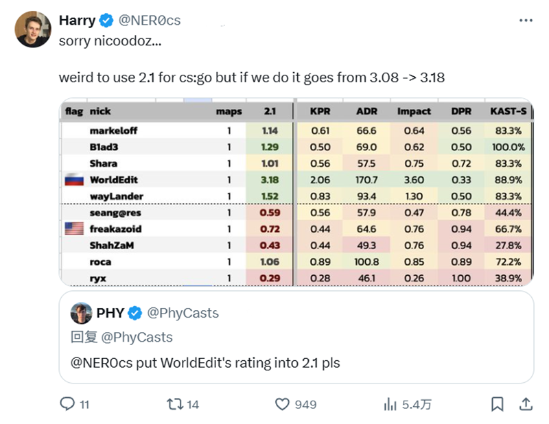 不过HLTV编辑NER0按照rating 2.1重新统计了WorldEdit那场比赛的数据,后者的rating从3.08变成了3.18,超过了nicoodoz的3.08 rating。